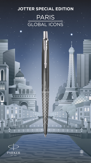 In navolging van de recente tournee langs wereldberoemde steden, gaat de Jotter Special Edition ‘Global Icons’-collectie naar vier nieuwe opwindende bestemmingen in de wereld. Adembenemende bezienswaardigheden te midden van een betoverende sfeer vormen de inspiratie voor de Jotter Special Edition Paris. De tijdloze schoonheid van de elegante grijze tinten van de Parijse architectuur, de complexe patronen die de historische en hedendaagse monumenten sieren; elk element draagt bij aan het ontwerp van de pen. Met het unieke vakmanschap van Parker is het ontwerp vakkundig in de huls van dit fraaie schrijfinstrument gelaserd. Een grijs gelakte afwerking, de soepele schrijfervaring en de kenmerkende klik van de Jotter maken de pen compleet. Voor elke avonturier die een stap zet in de wereld van luxe schrijfwaren, is de Jotter Special Edition Paris een reis die ze niet snel zullen vergeten.