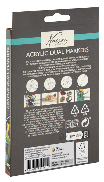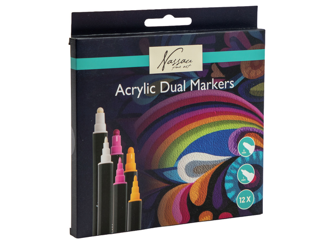 Deze set van 6 dubbele acrylstiften (1 mm en 3 mm) is een veelzijdige markerset die ideaal is voor creatieve projecten thuis, op school of tijdens hobbywerk. Elke marker heeft twee uiteinden: een fijne punt voor precieze lijnen en details, en een brede punt om grotere vlakken snel in te kleuren. De acrylinkt is op waterbasis en dekkend, waardoor je levendige resultaten krijgt op uiteenlopende oppervlakken zoals papier, karton, hout, steen, textiel en glas.