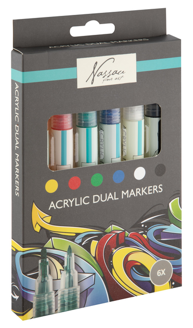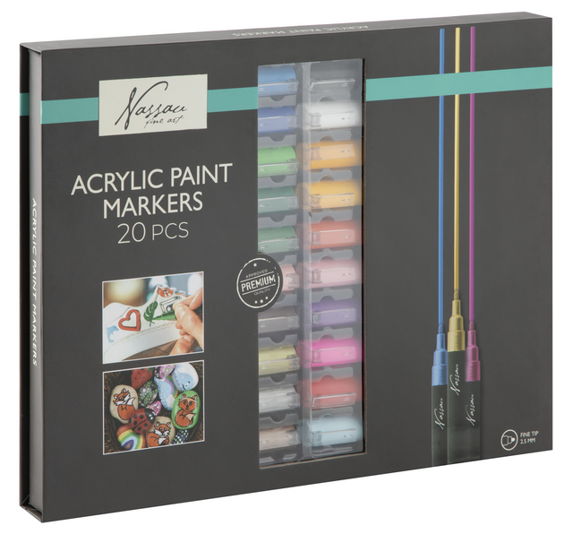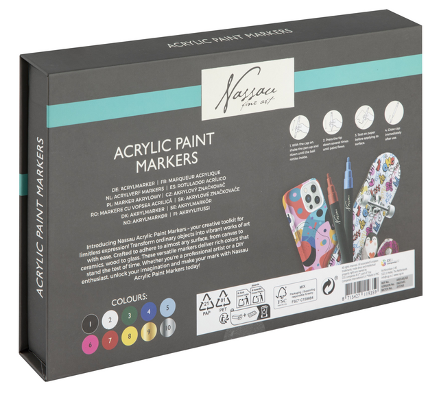 Ontdek de Nassau Fine Art 10-delige Acrylmarkers Set, de ideale keuze voor elke creatieve geest. Deze premium set biedt een scala aan levendige kleuren die jouw artistieke visie tot leven brengen. Of je nu een professional bent of een liefhebber van DIY-projecten, deze stiften zullen je inspireren.Professionele Kwaliteit: Elk van deze acrylverf stiften is gevuld met hoogwaardige inkt die garant staat voor een soepele toepassing en een indrukwekkende dekking.Fijne Punten: De stiften hebben een nauwkeurige fijne punt van 2.5 mm, perfect voor gedetailleerd werk en het creëren van strakke lijnen.Veelzijdigheid: Geschikt voor gebruik op canvas, hout, stof, en meer. De Nassau acrylmarkers zijn jouw partner voor elk oppervlak.Levendige Kleurenspectrum: De set bevat een assortiment aan levendige kleuren die je werk doen opvallen en jouw creaties een extra dimensie geven. ''Inclusief Goud & Zilver''Sneldrogend: De inkt is sneldrogend en resistent tegen vervagen, waardoor je kunstwerken langdurig hun kleur behouden.