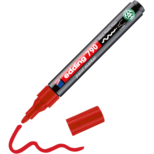 De edding 790 lakmarker maakt het werkleven veel gemakkelijker. Het is een betrouwbaar hulpmiddel om te schrijven op donkere, transparante en gladde materialen zoals glas, metaal en kunststof. Daarom wordt het in allerlei industrieën voor dagelijkse werkzaamheden gebruikt. Voor gebruik: Schud de marker met de dop erop. Verwijder de dop. Pomp de marker met de punt omlaag op bijv. een stuk afvalpapier. Pomp deze voorzichtig op en neer tot de punt met inkt is gevuld. De marker is nu gereed voor gebruik. Horizontaal bewaren.Eigenschappen: