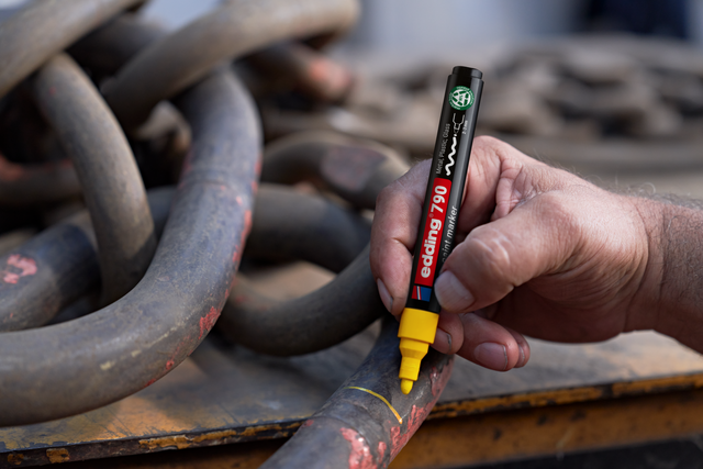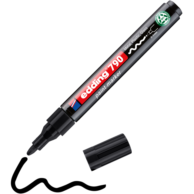 De edding 790 lakmarker maakt het werkleven veel gemakkelijker. Het is een betrouwbaar hulpmiddel om te schrijven op donkere, transparante en gladde materialen zoals glas, metaal en kunststof. Daarom wordt het in allerlei industrieën voor dagelijkse werkzaamheden gebruikt. Voor gebruik: Schud de marker met de dop erop. Verwijder de dop. Pomp de marker met de punt omlaag op bijv. een stuk afvalpapier. Pomp deze voorzichtig op en neer tot de punt met inkt is gevuld. De marker is nu gereed voor gebruik. Horizontaal bewaren.Eigenschappen: