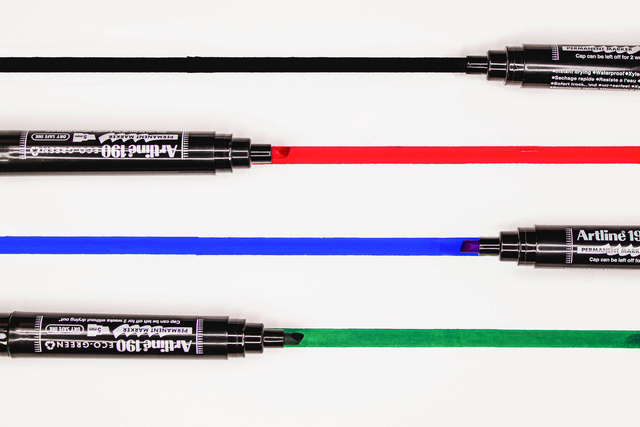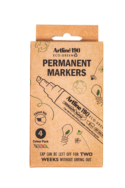 Ecologische Permanent Markers gemaakt uit 64% gerecycled materiaal met Dry-Safe inkt die 2 weken zonder dop kunnen blijven zonder uit te drogen. Beitelpunt 2-5 mm. Kleur : zwart – rood – blauw – groen. Verpakt in Kraft doosje. Gecertifieerd door Eco Mark-label. Post consumer recycled plastic.